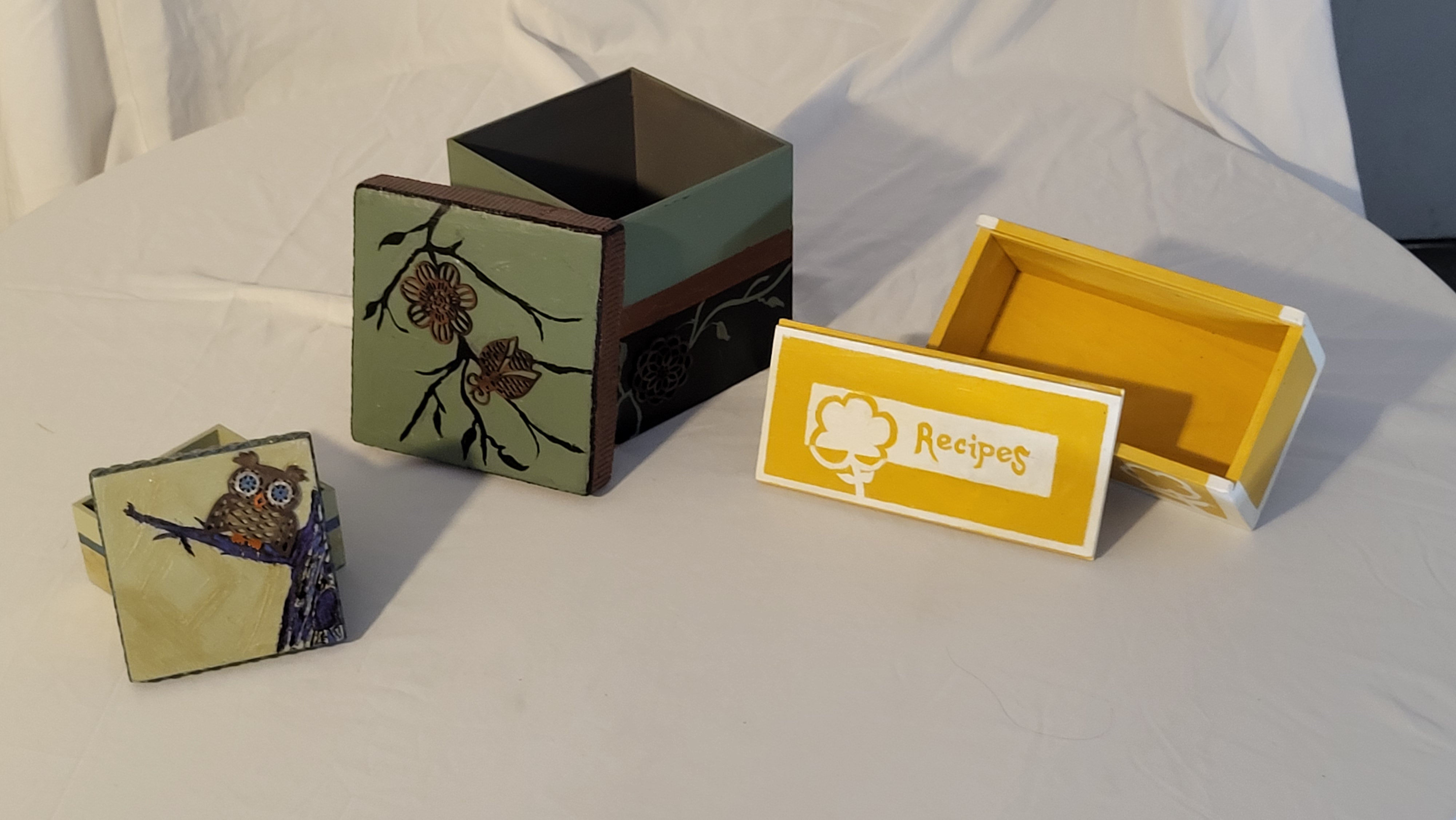 My processes are quite unique and tedious, I must say. By that, I mean my boxes are crafted mostly from recycled cell phone boxes, or any sturdily manufactured product. I disassemble them to give them more height and area within the box, and then put to work my skills to give them life with panache, pizzazz, and polish!